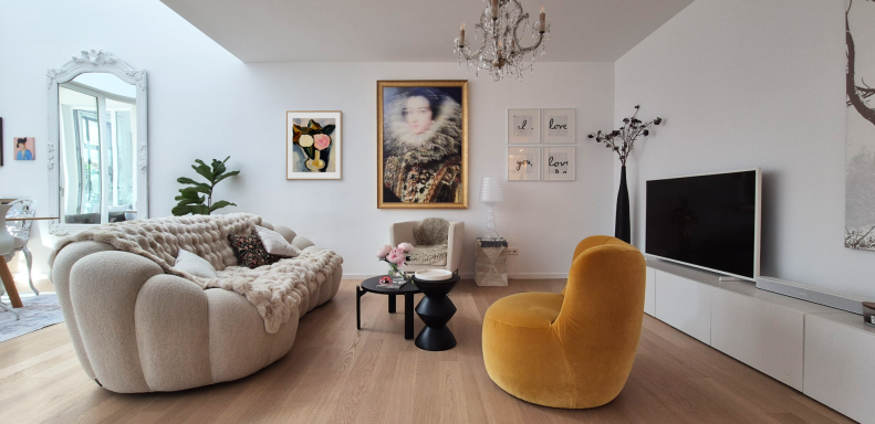 Beim Gestalten des Interieurs für ihre eigene Familie hat Diana Schreiter das Potenzial einer anspruchsvollen Raumfläche dank dem gut durchdachten Grundriss entfaltet und sie mit hellen Farben sowie außergewöhnlichen Accessoires und Möbeln ihrer Lieblingsdesigner gefüllt.